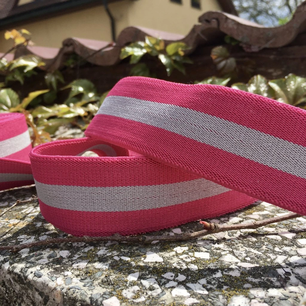 Hodně pružící ale zároveň jemná guma do pasu v růžové barvě s šedým pruhem, plochá, šířka 40 mm. Velmi kvalitní pruženka, která se bude perfektně vyjímat jako zdobná pasová pruženka na sukních či kalhotách.