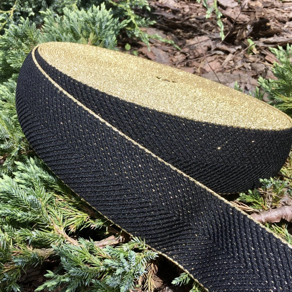 Guma do pasu se stromečkovým vzorem v černé barvě, zlatě protkávaná, plochá, šířka 60 mm. Velmi kvalitní pruženka, která se hodí hlavně jako zdobná pasová guma na sukních či kalhotech.