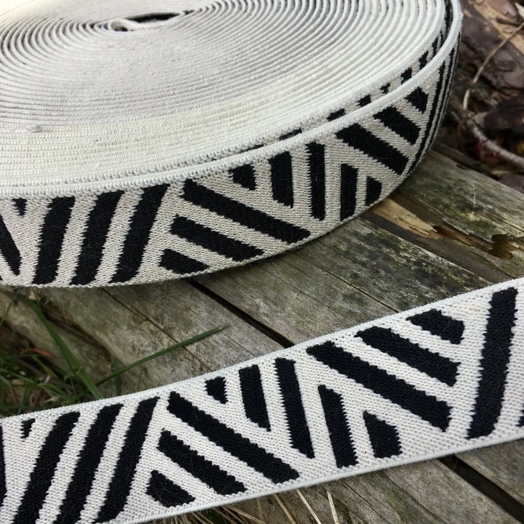 Guma do pasu s černými proužky na krémovém podkladu, plochá, šířka 30 mm. Nádherná pruženka, po roztažení se vrátí do původního stavu. Hodí se hlavně jako zdobná pasová guma na sukních či kalhotách.