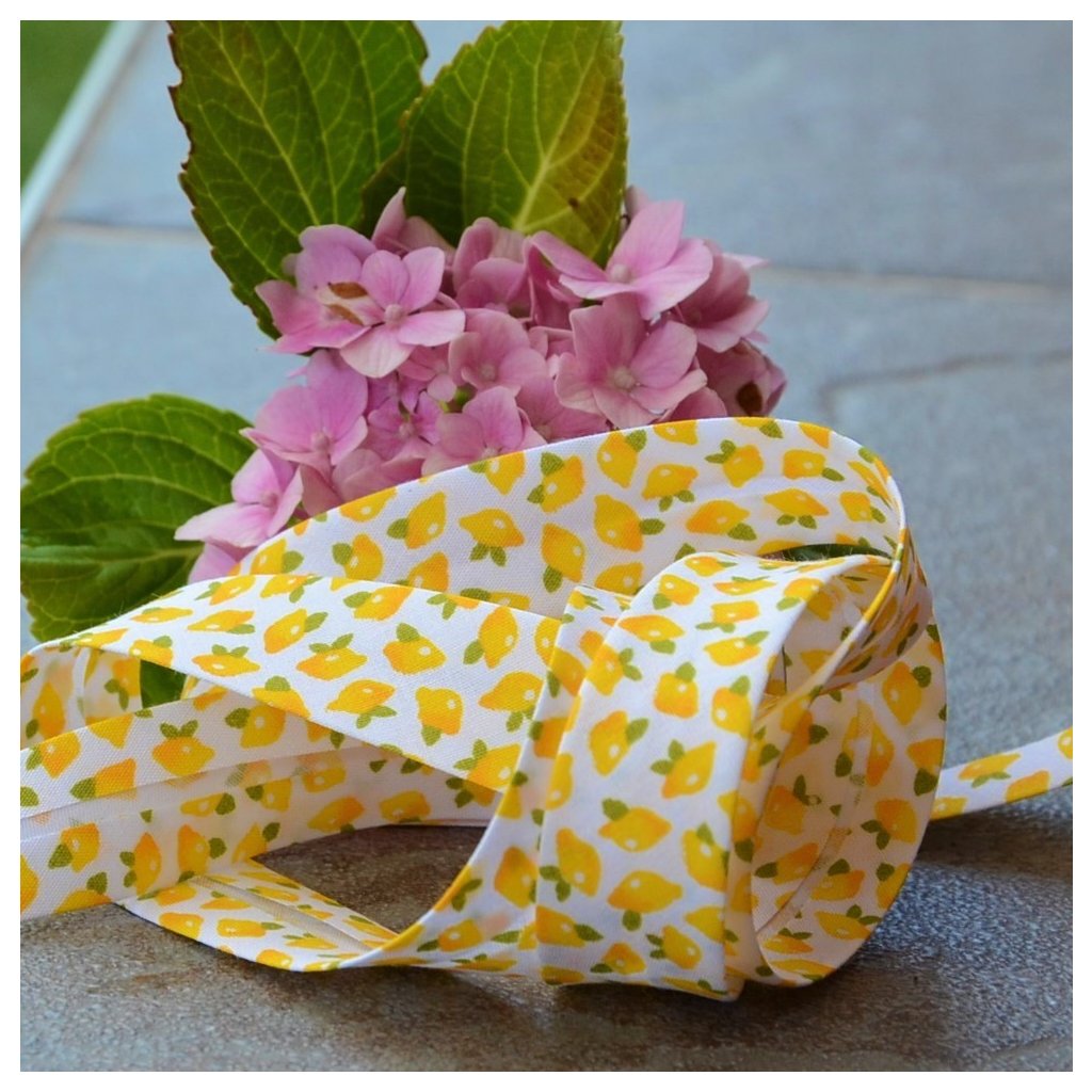 Šikmý proužek s motivem citrónů na bílém podkladu - šíře proužku před přeložením 18 mm. Po našití proužku je jeho šíře 9 mm.