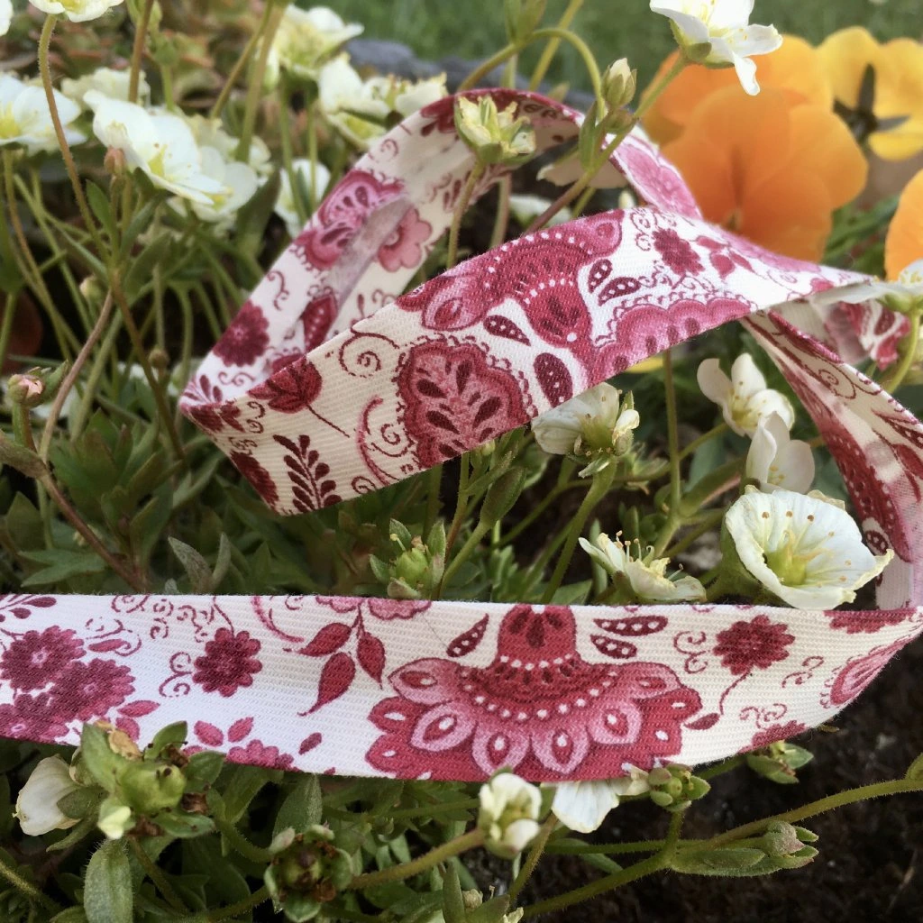 Šikmý proužek s retro vínovým květinovým vzorem - šíře proužku před přeložením 18 mm. Po našití proužku je jeho šíře 9 mm.