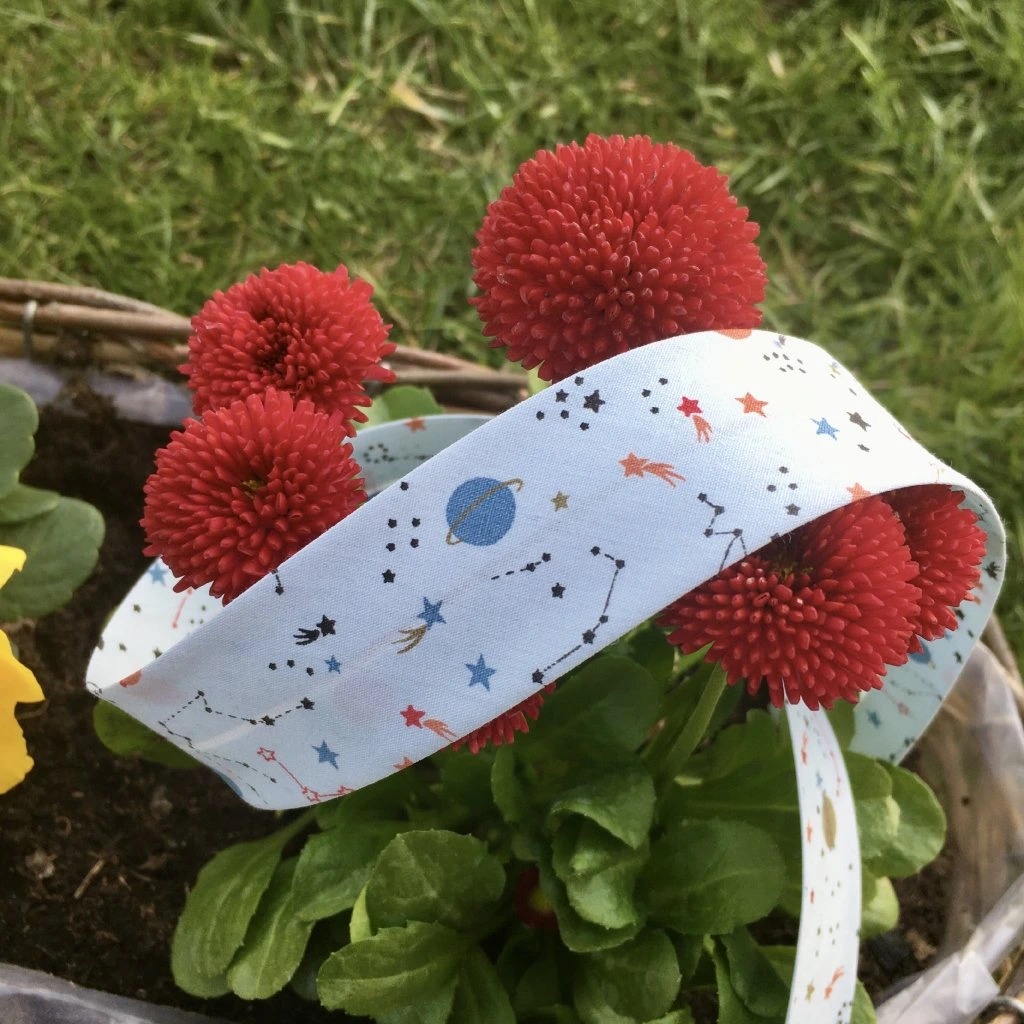 Zažehlený lemovací proužek ze 100% biobavlny s krásným vzorem planet, hvězd a souhvězdí na světle modrém podkladu.