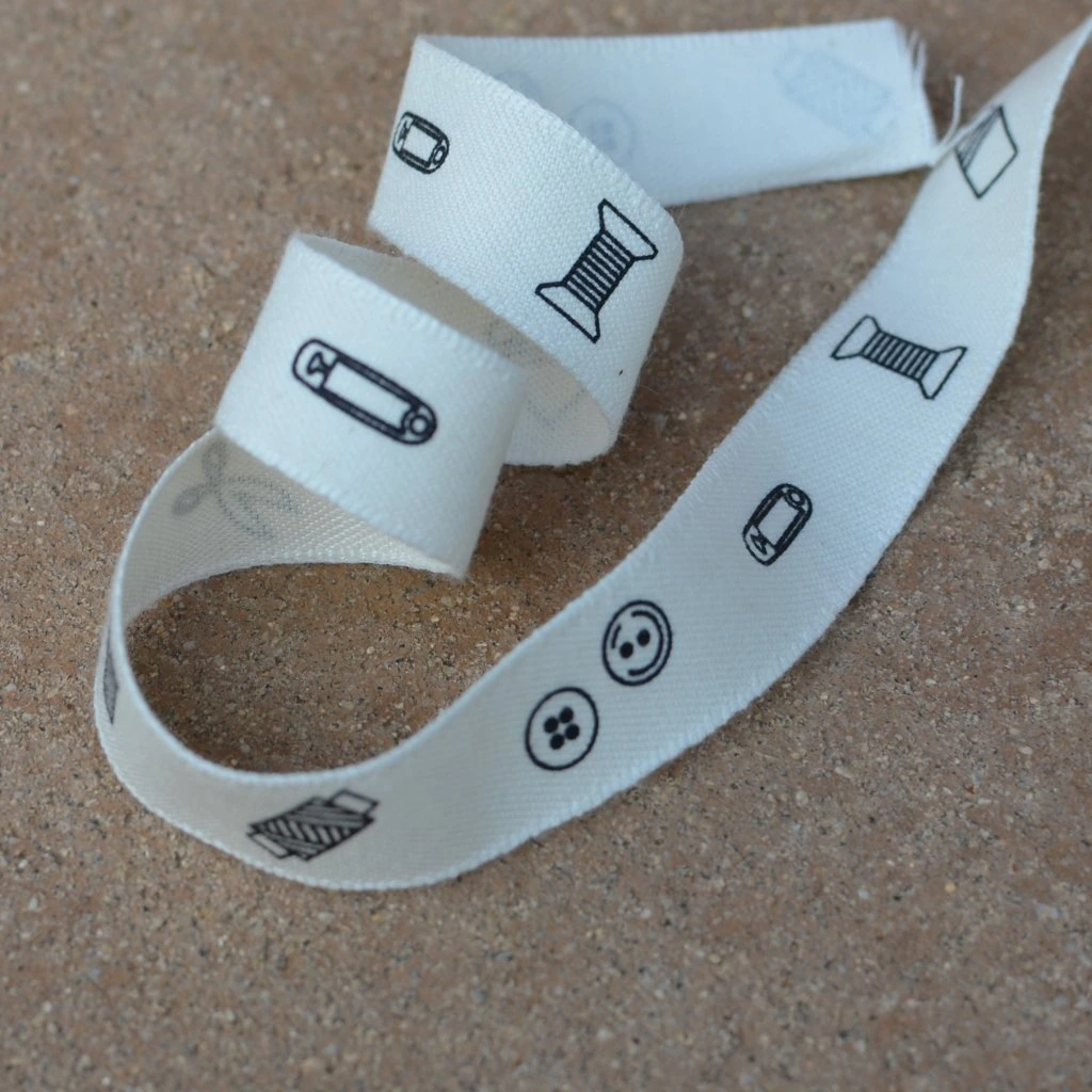 Nádherná stuha s motivem šití (nitě, nůžky, knoflíky, náprstek) v přírodní bílé barvě, šířka stuhy 14 mm.