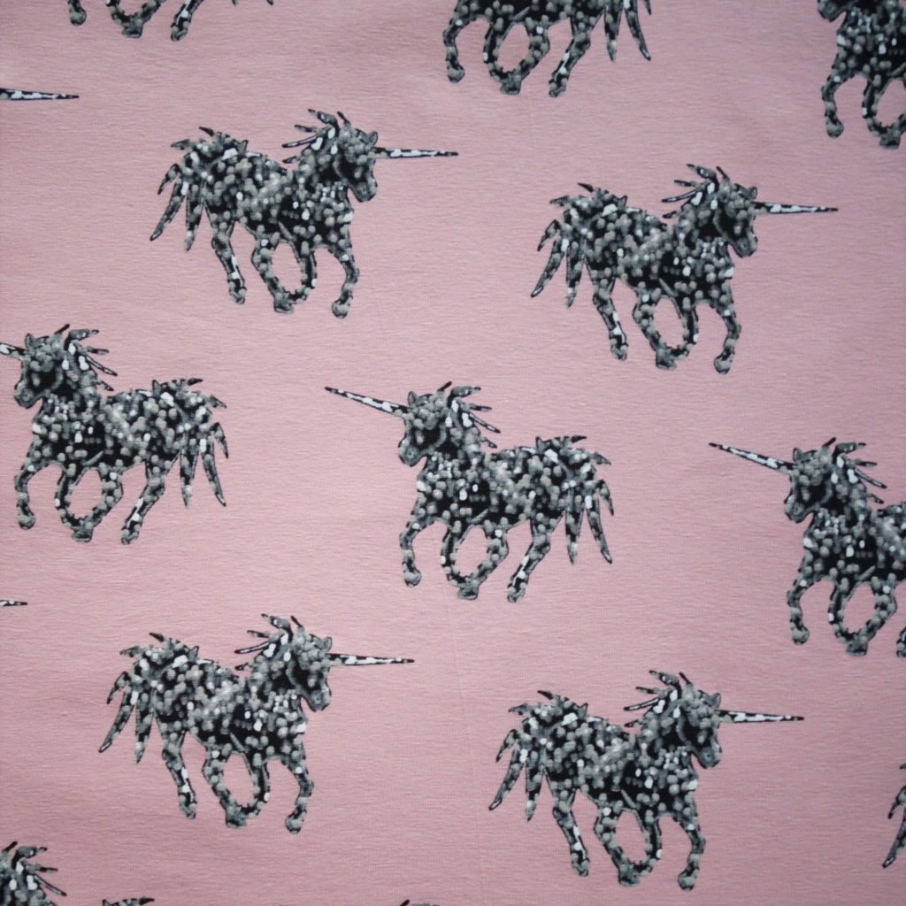 Jednorožci jsou hit a na starorůžovém podkladu dvojnásob. Perfektně se budou vyjímat na šatech, tričkách, legínách, čepicích a všem dalším, co vás jen napadne ušít z příjemného úpletu.