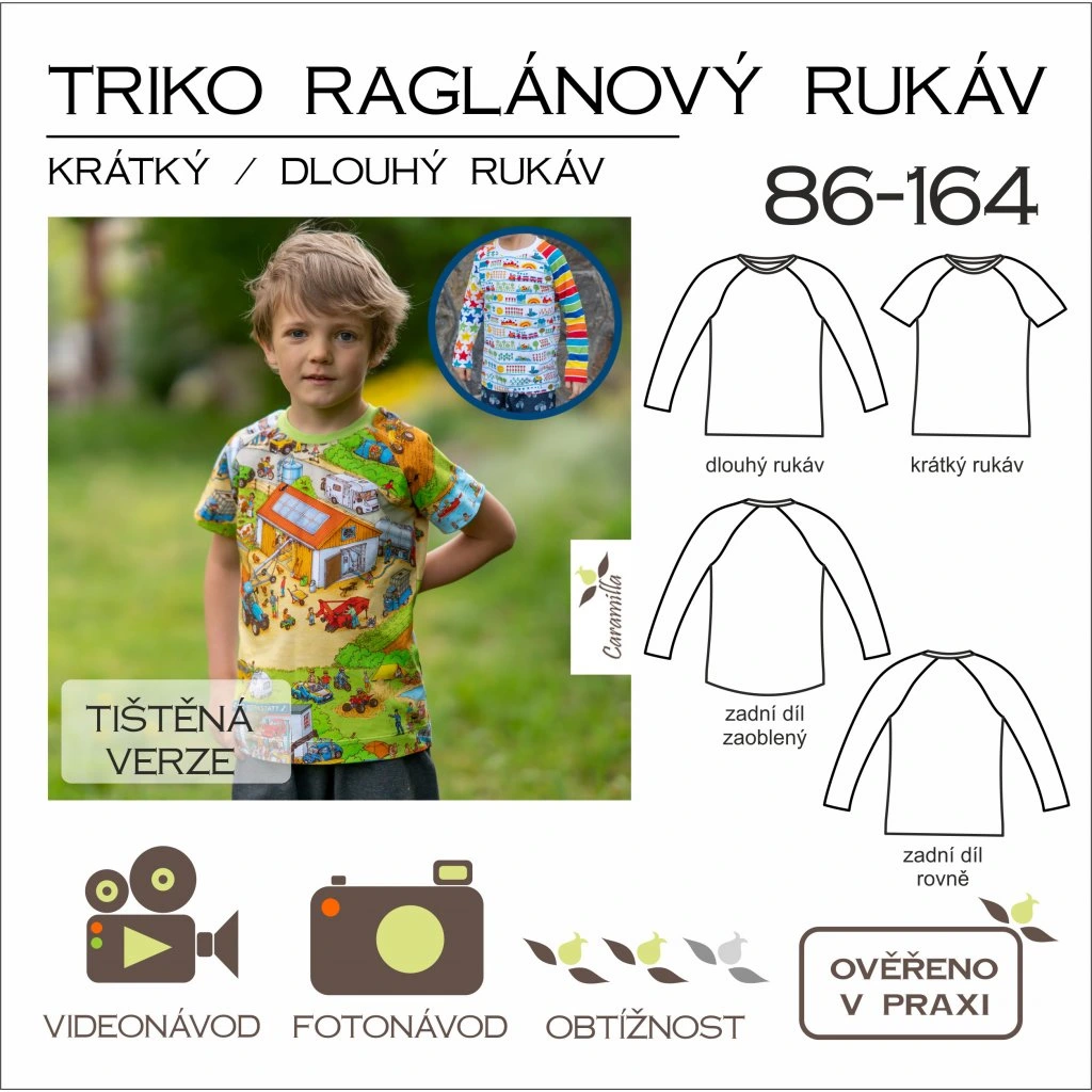 Mnoha švadlenkami otestovaný střih Caramilla na dětské triko s raglánovým rukávem (krátký i dlouhý rukáv) ve velikostech 86 - 164.