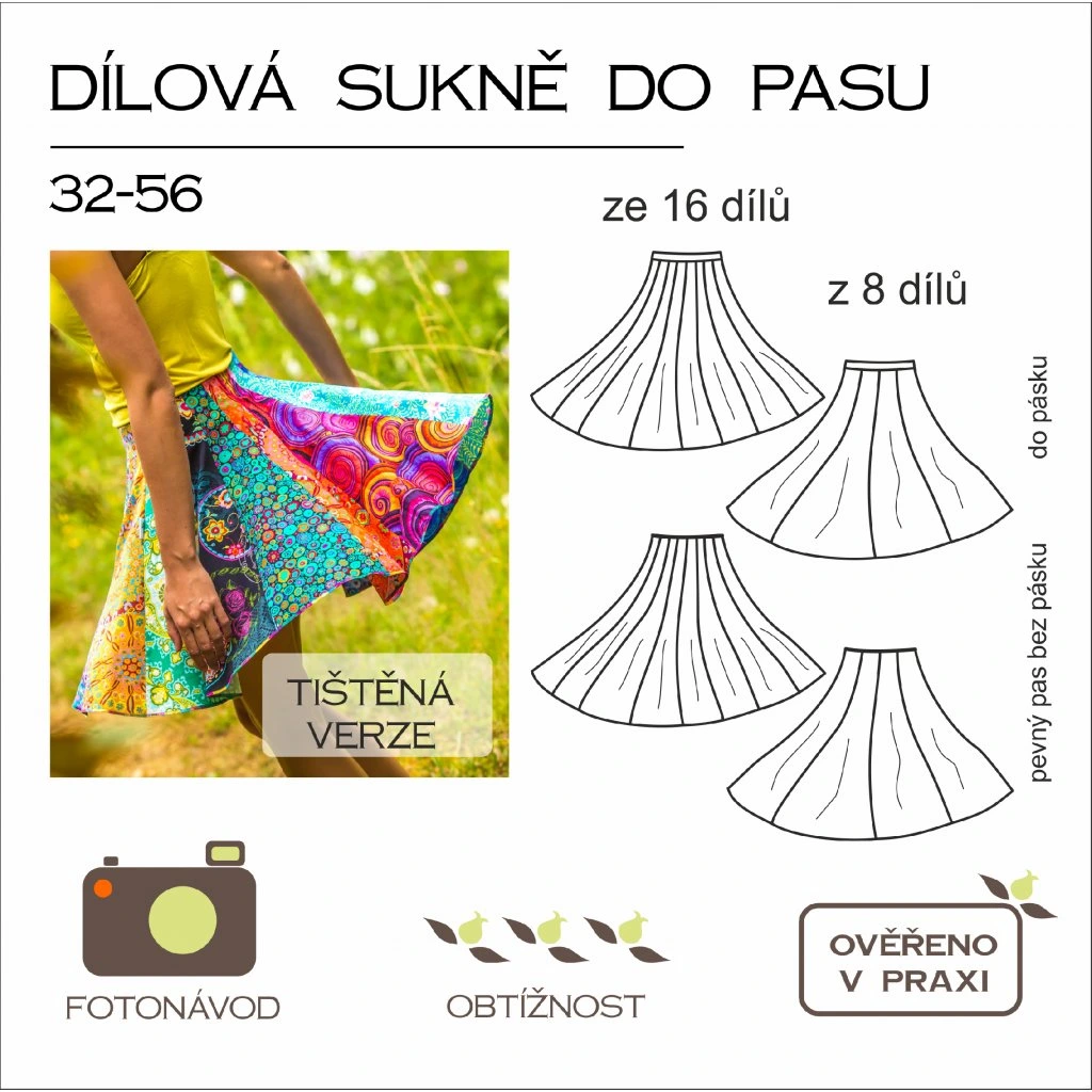 - barevný krycí list s nákresem sukně, soupis potřebných a vhodných materiálů včetně spotřeby dle velikostí, tabulku velikostí, doporučené polohování střihu na látku, QR kód a odkaz na foto a videonávod