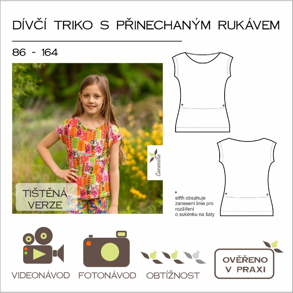 Mnoha švadlenkami otestovaný střih Caramilla na dívčí triko s přinechaným rukávem ve velikostech 86-164.
