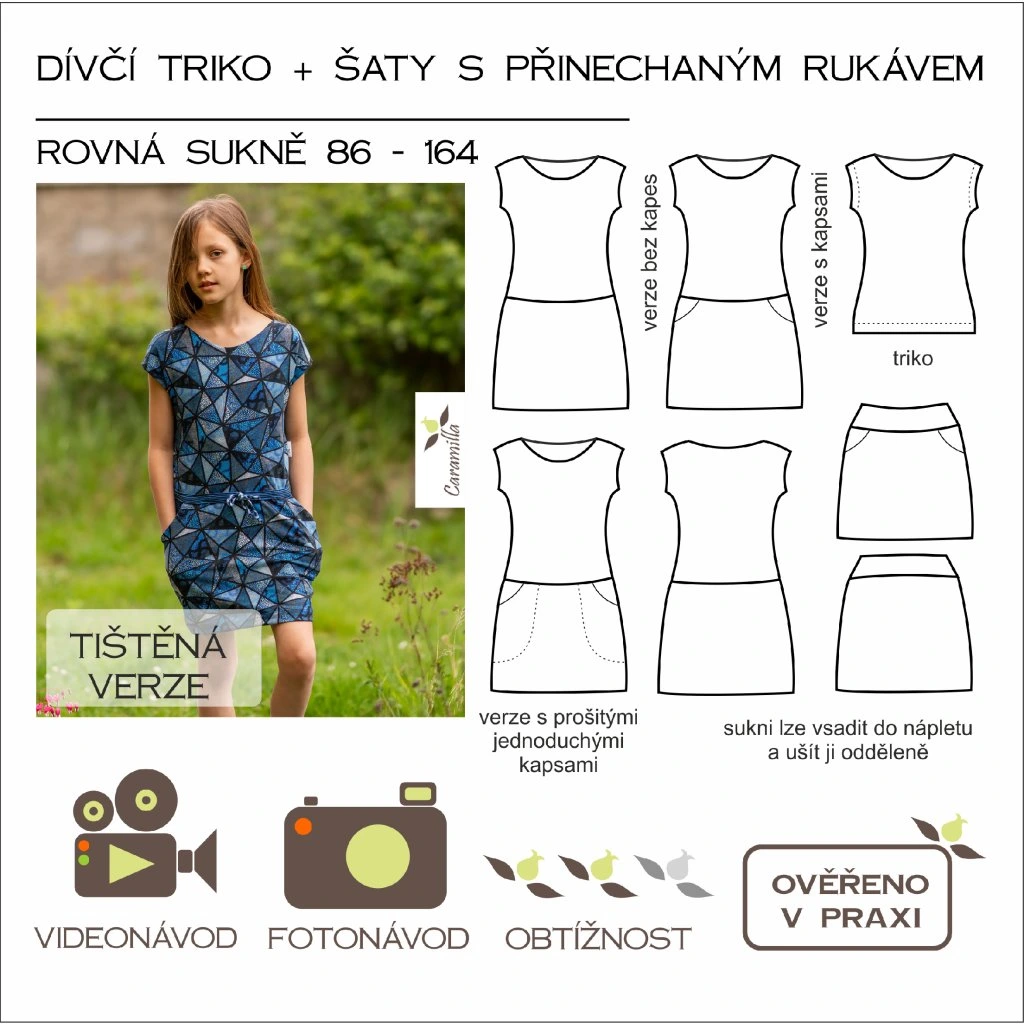 Mnoha švadlenkami otestovaný střih Caramilla na dívčí triko a šaty s přinechaným rukávem a rovnou sukní ve velikostech 86 - 164.