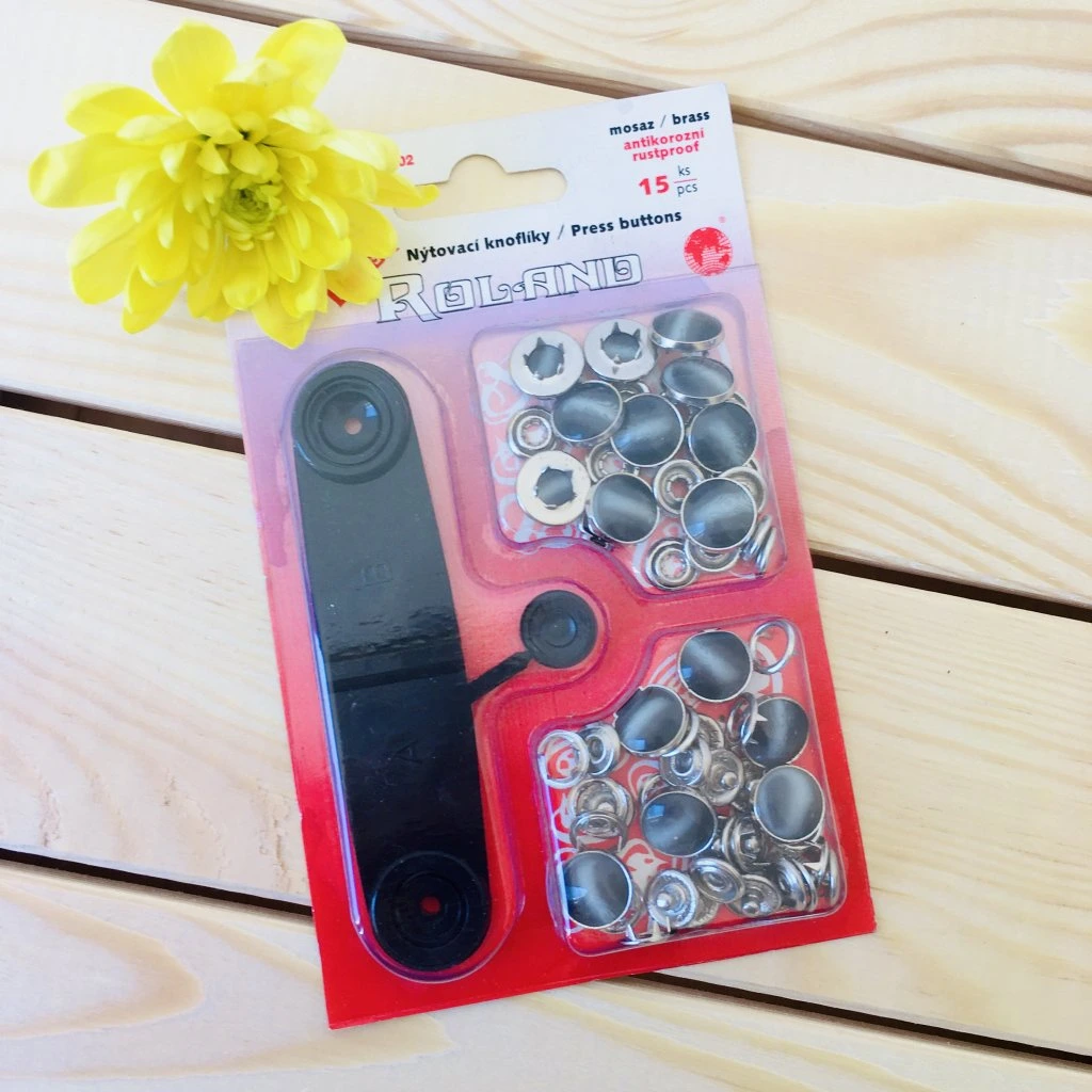 Nerezavějící mosazné nýtovací knoflíky Roland Decor jsou vhodné ke spojování jemných a poddajných druhů látek jako např. froté, úplety, košilovina aj. Průměr 13 mm.
