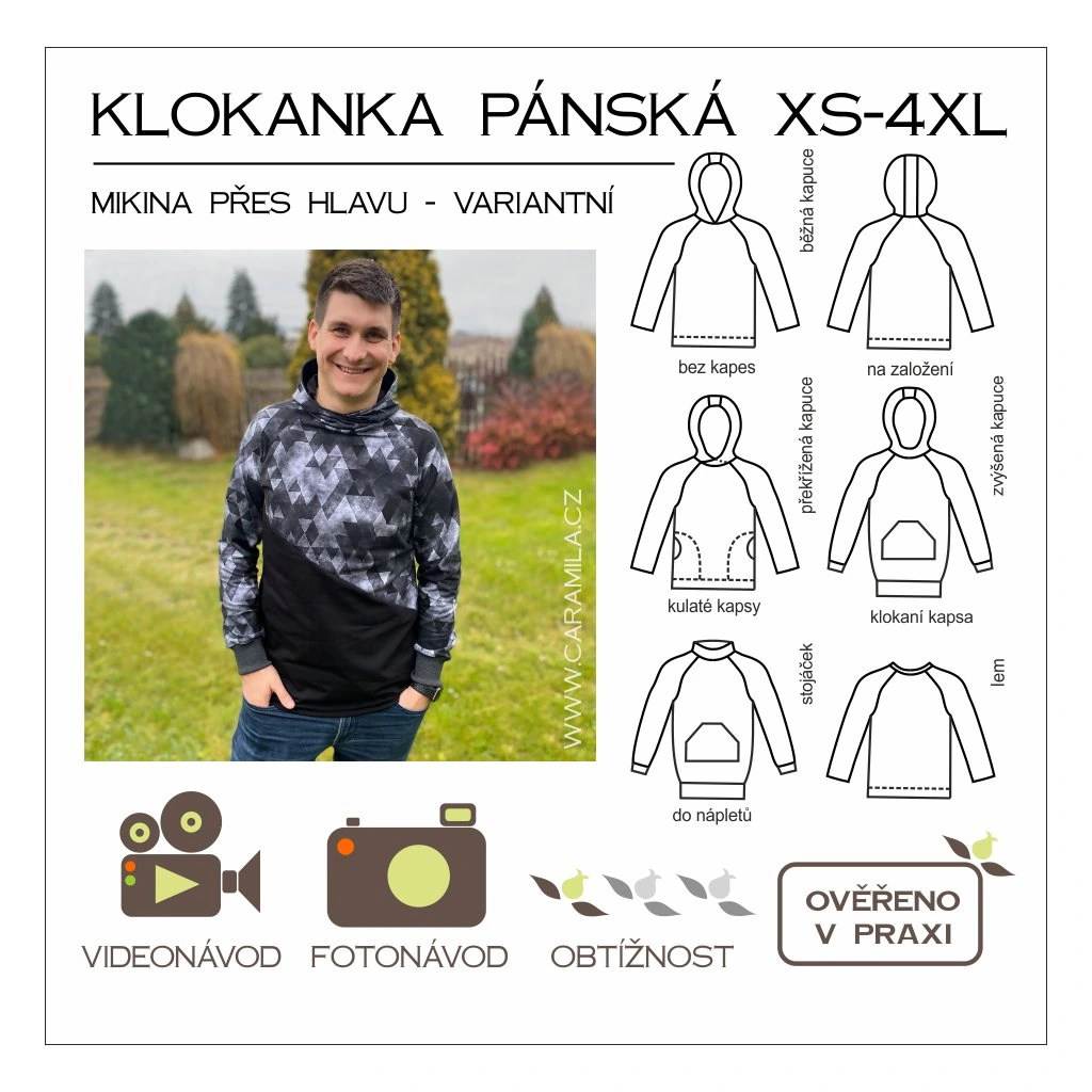 Mnoha švadlenkami otestovaný střih Caramilla na pánskou mikinu přes hlavu v několika variantách typu kapucí/stojáčku a kapes ve velikostech XS - 4XL.