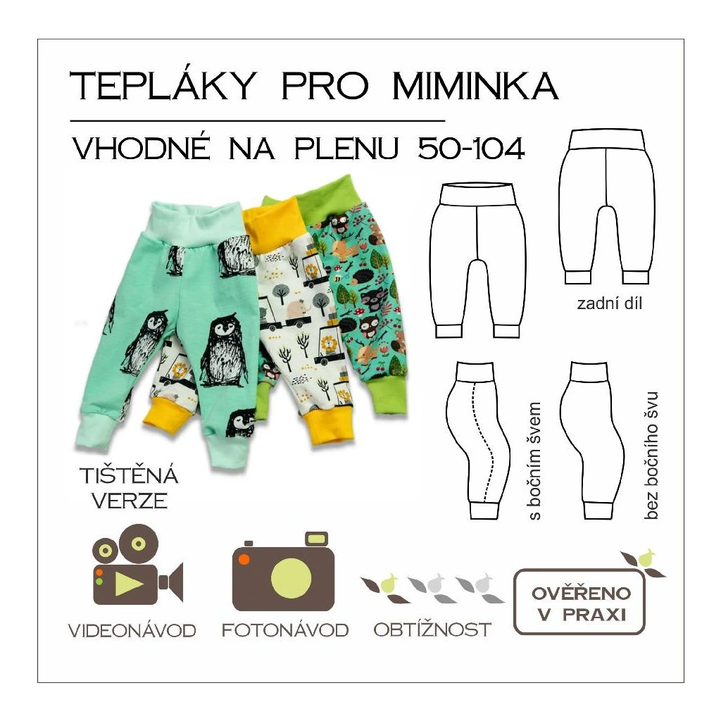 Střih na pohodlné tepláky pro miminka nosící pleny. Střih obsahuje variantu bez bočního švu (šije se podobně jako legíny) a variantu s bočním švem (šije se jako běžné tepláky).