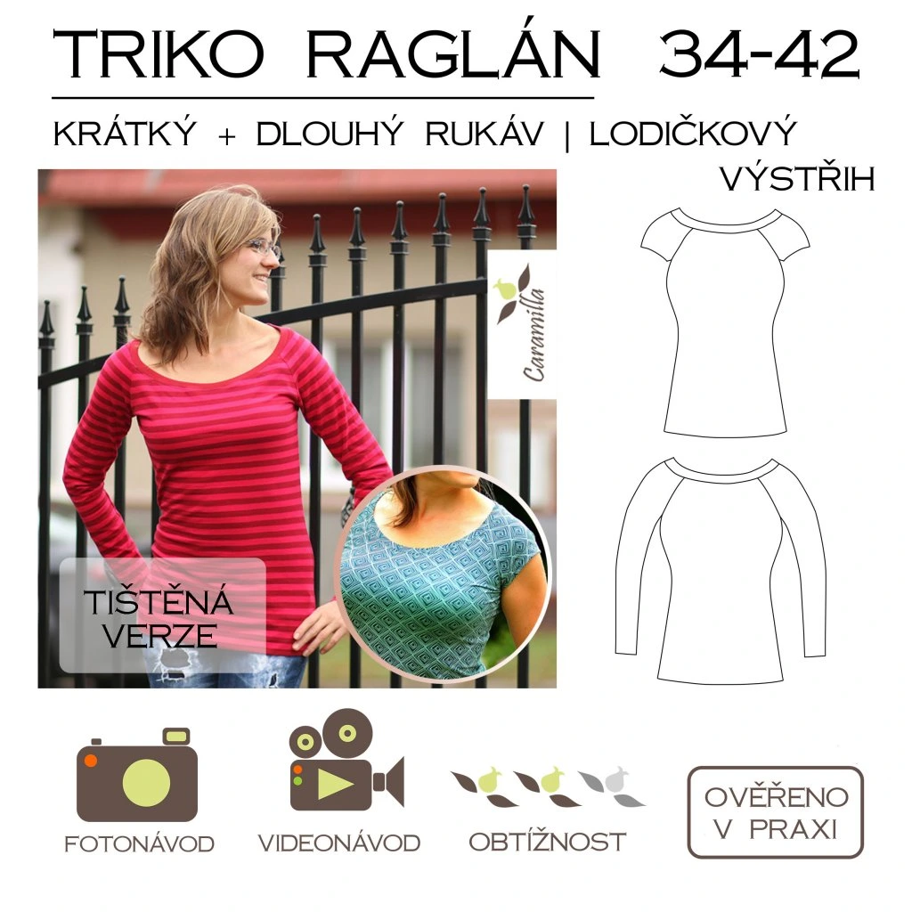 Mnoha švadlenkami otestovaný střih Caramilla na triko s raglánovým rukávem a lodičkovým výstřihem ve velikostech 34 - 42. Varianta s krátkým i dlouhým rukávem. Rukávy mají délku 65 cm od ramene.