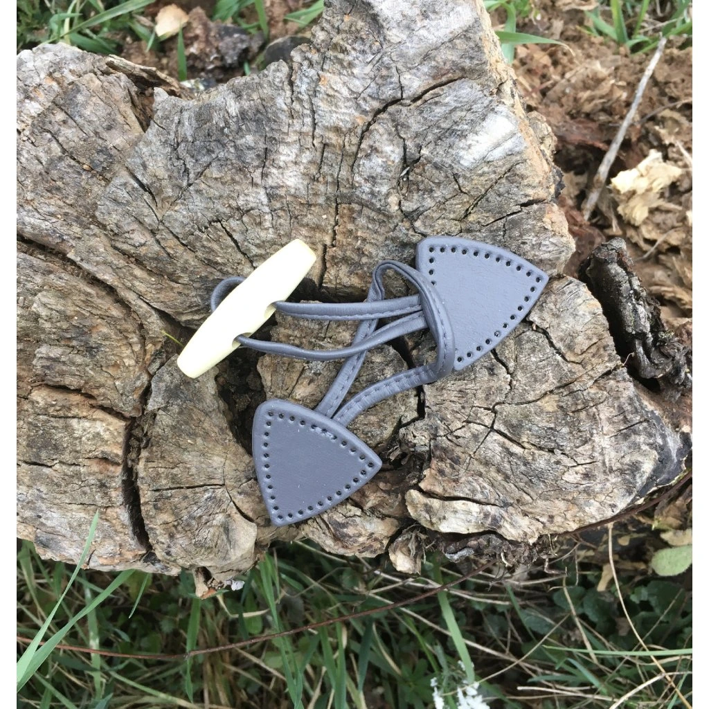 Šedé zapínací knoflíky z umělé kůže vhodné pro vaše kabáty, vesty či saka. Trojúhelníky mají perforované okraje, tudíž jsou vhodné i pro ruční šití. Se svým podlouhlým zapínacím knoflíkem ze světlého dřeva a širokou smyčkou se dají snadno otevřít a zavřít jednou rukou.
