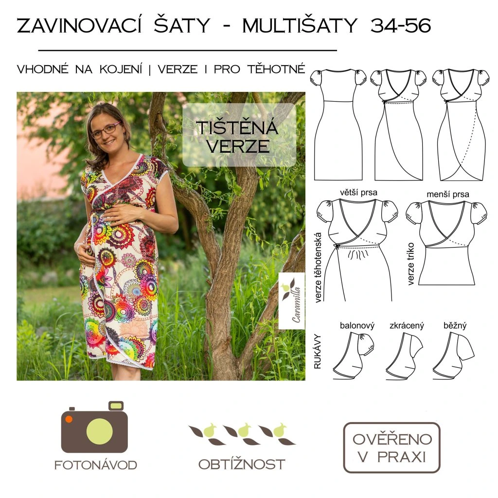 Mnoha švadlenkami otestovaný střih Caramilla na krásné zavinovací šaty v několika verzích vhodné i na kojení nebo jako těhotenské ve velikostech 34 - 56.